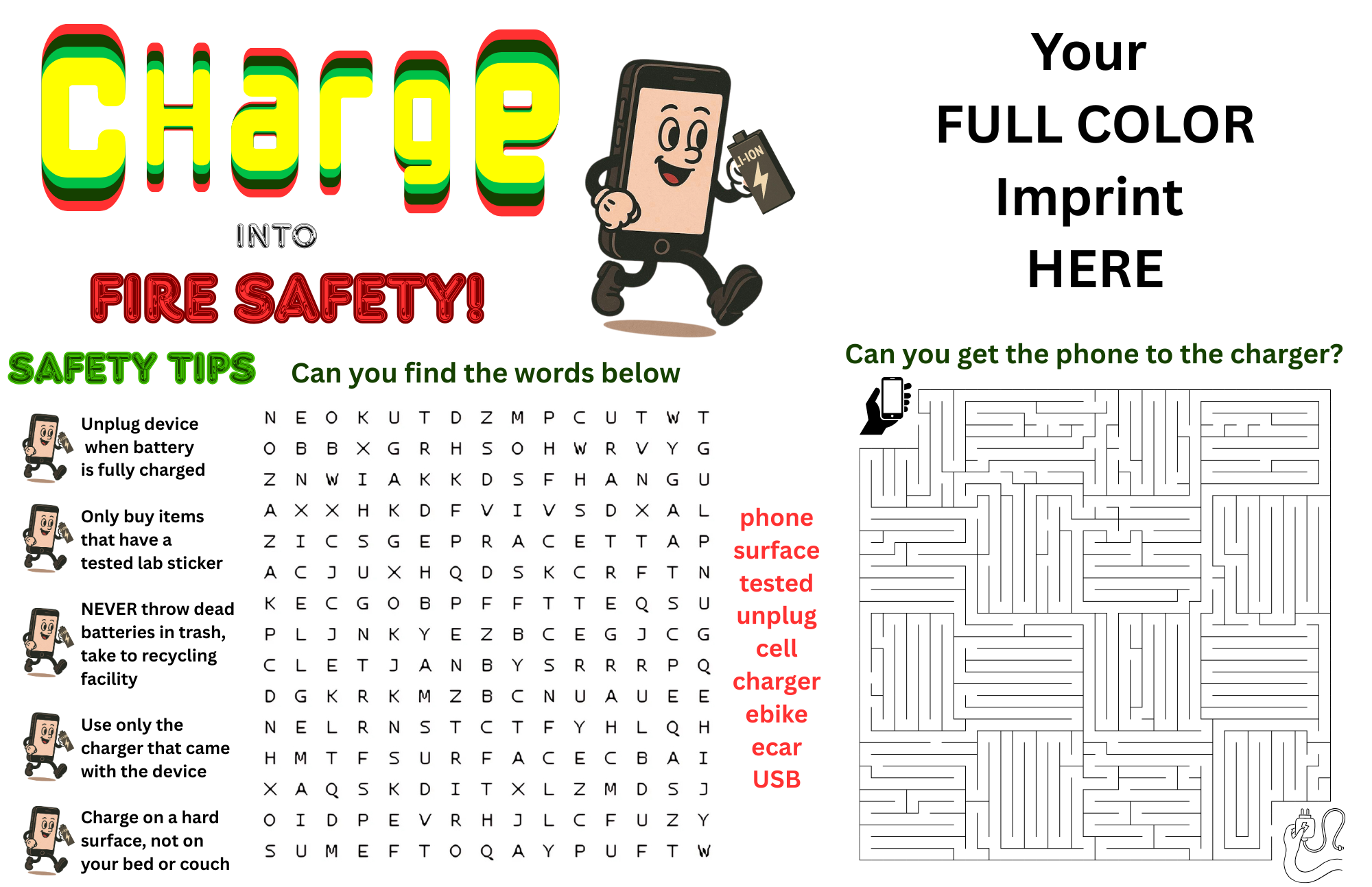 This placemat is about fire safety with lithium batteries. Full color imprint.