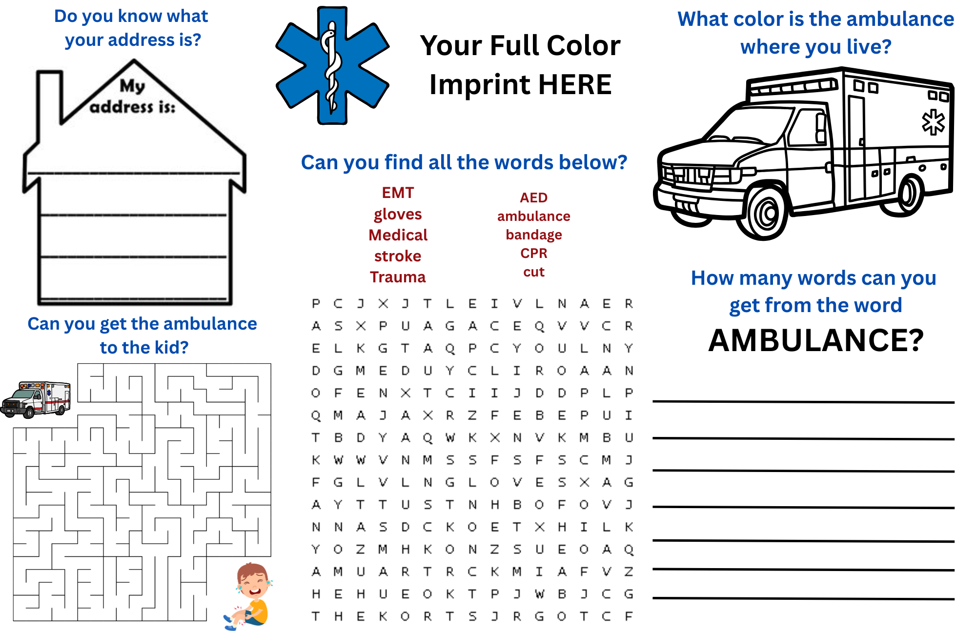 This placemat is filled with fun stuff about EMS! Full color imprint!